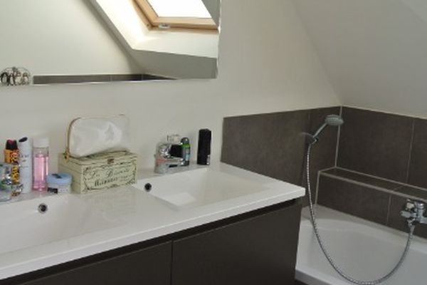 - Badkamer met bad, douche en dubbel lavabomeubel