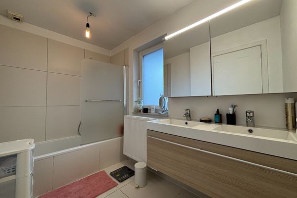 - Badkamer met ligbad met douchevoorziening en dubbel lavabomeubel