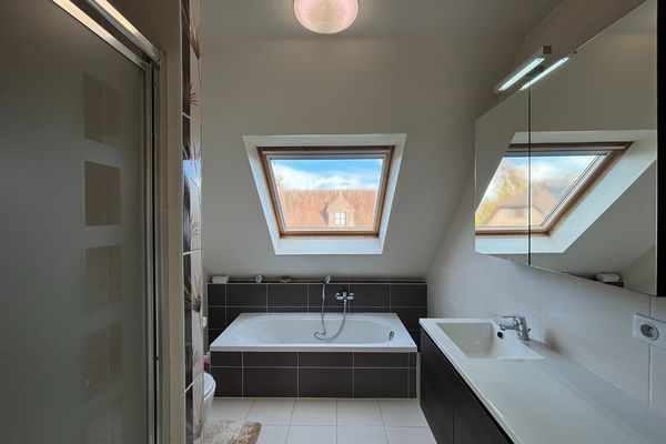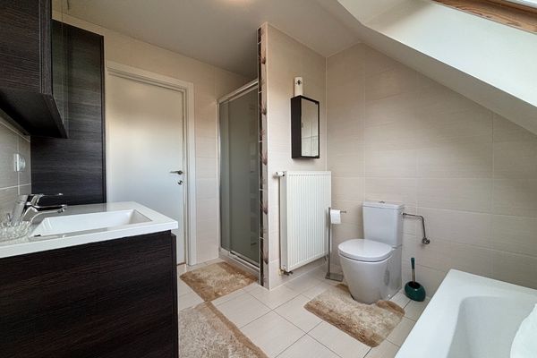 - Badkamer met ligbad, inloopdouche, lavabomeubel en toilet