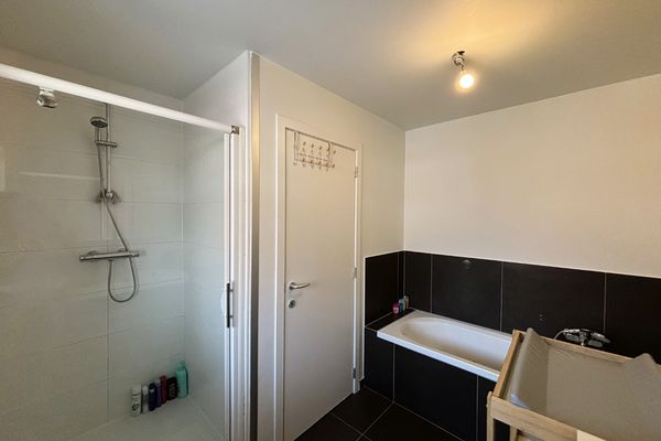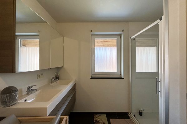 - Badkamer met dubbel lavabomeubel, ligbad en douche